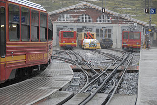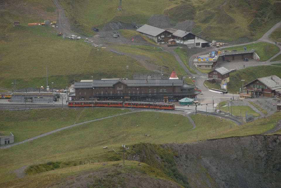 鉄道職員とおぼしき人に訊いたら、この列車に乗っていれば良いのだとのこと。英語の通じやすい観光地でよかった。しばらくすると、スイッチバックして逆方向に列車は進み出した。そして、クライネ・シャイデック Kleine Scheidegg 2061mに到着。さて、乗り換えであるが、駅ビルの向こう側に登山鉄道は停まっていた。しかし、2〜3編成停まっている。どれもユングラウヨッホとレールがつながっている。ユングラウヨッホに近い場所に停車中の列車かと思えばさにあらず。駅の奥の方、手前のホームに停車している列車がそうだった。観光客の会話を聞いていると2時45分発とのことだったが、時刻表を持っていないし、この時点では駅の黄色い時刻表の場所もわからなかった。トイレに行っている間に発車しないか心配しながらトイレを済まして列車に乗った。