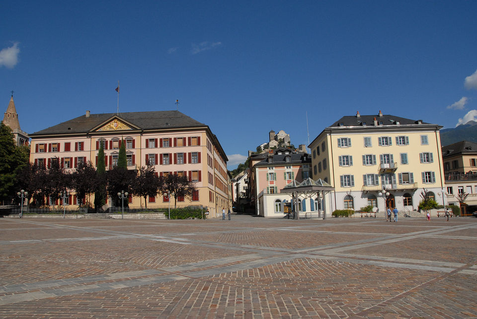 高速を降りて数分でシオンの城と教会の近くまで来たが、どうもスイス観光局のホームページのようなビューポイントがない。クルマをパーキングに駐めて歩いた。広場や旧市街の石畳の道も歩いた。雰囲気のある町であるが、観光の時間はない。そそくさとクルマまで戻った。クルマの来ないのを確認して、車道の真ん中で撮影した。城と教会が並び立っている写真はとりあえず撮れたが、街路樹と道路の照明灯が邪魔だった。あるいは、マルティからずっと続くブドウ畑に登れば良かったのか?。しかし、時間は午後4時過ぎ。ツェルマットへ急がなくてはならない。諦めて高速道路に乗った。