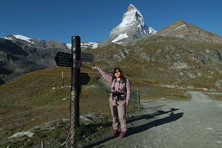 途中、リフトの頂上駅付近で羊の群れに出会った。しばらく、羊たちの写真を撮った。杖を置いて、身を低くして、少しずつ少しずつ近づいて、音をさせないようにして写真を撮った。10分くらいすると、近づいても逃げなくなった。むしろ、二匹ほどが向こうの方から迫ってきた。私のズボンの臭いを嗅いでいる。羊といっても角があるので、大丈夫かなと思った。しばらくすると、羊たちもつかず離れずで、マッターホルンを背景に写真をたくさん撮らせてくれた。