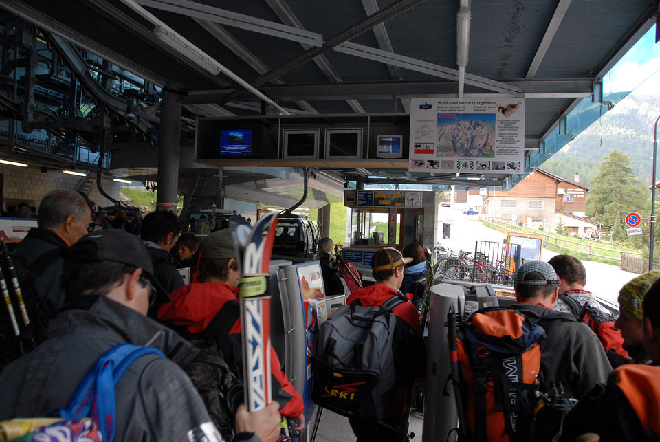 朝、8時20分くらいにゴンドラ乗り場下のエレベーター乗り場に着いてもエレベーターが動いていない。見上げるとゴンドラが止まっている。あれっ運休?。念のため、エレベーター近くの坂を登った。すると、スキーを担いだ数十名がゴンドラ乗り場に並んでいた。どうやら、8時30分からの営業?だったらしい。スキー客はフーリ furi でトロッケナー・シュテーク Trockenaer Steg 方面に乗り換え、私たちはシュバルツゼー Schwarzsee 方面のゴンドラに乗り換えた。