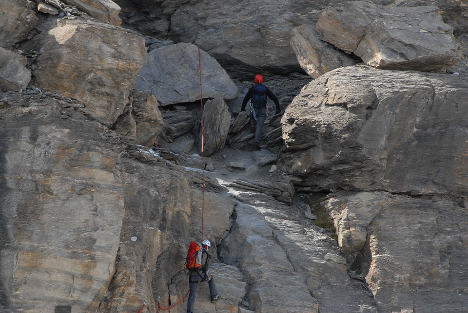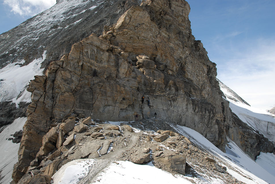 ヘルンリ・ヒュッテは標高3260m。山頂まであと 1218m。ヒュッテ近くに滞在する時間だけでも、何組かの登山家が登りはじめ、また降りてきた。よくもまあ、こんな垂直な崖をロープだけで上り下りできるものだ。