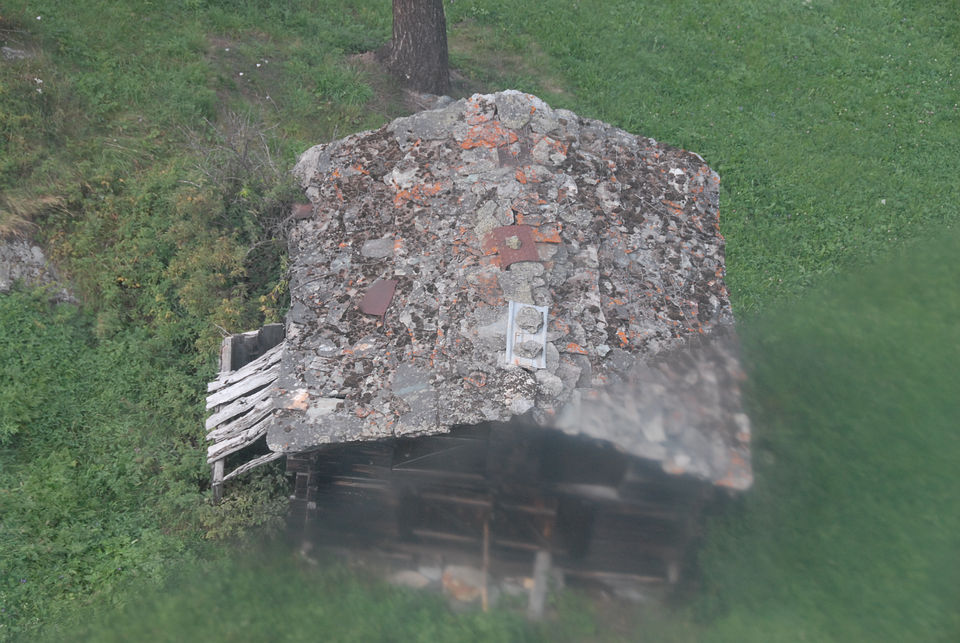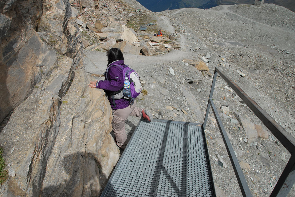 ヒュッテの先には、マッターホルン山頂を目指す登山家が最初によじ登る岩がある。その最初の赤いロープがある場所まで歩いて行った。その場所にはキリスト教の聖母像や何らかの文字が刻まれた銘板が貼ってあった。