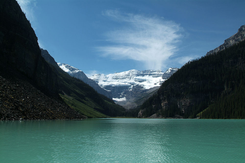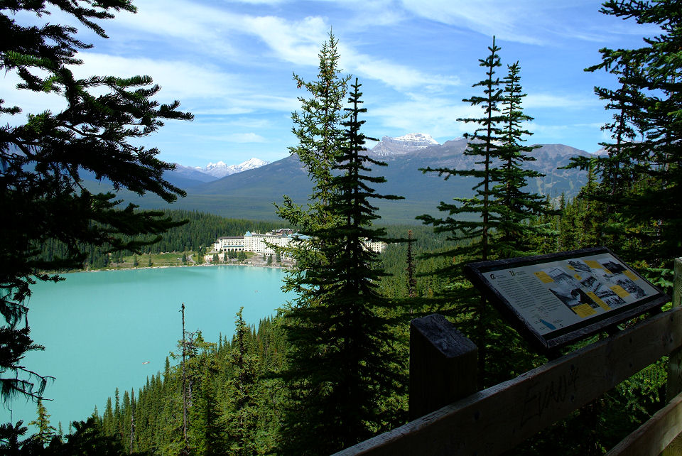 クルマを停めてから、レイク・ルイーズに向かうが The Fairmont Chateau Lake Louise ホテルの方向を目指した。後から考えると、丘の頂上の駐車場からトレイルの入口に向かうと近かったのである。結論からいうと、ホテルを目指したのは正解だった。ホテルの脇に達したとき、正面に広がったエメラルド色のルイーズ湖と正面のヴィクトリア山を見たときの光景は衝撃的ともいえるほど素晴らしいものだった。美しい!。時間を忘れて、その光景を観て、シャッターを押し続けた。