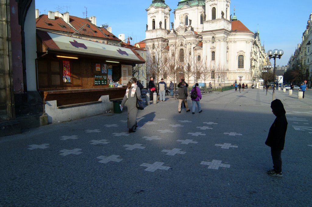 旧市庁舎と広場を取りまくの建物 旧市庁舎の正面?から 路上の十字は、